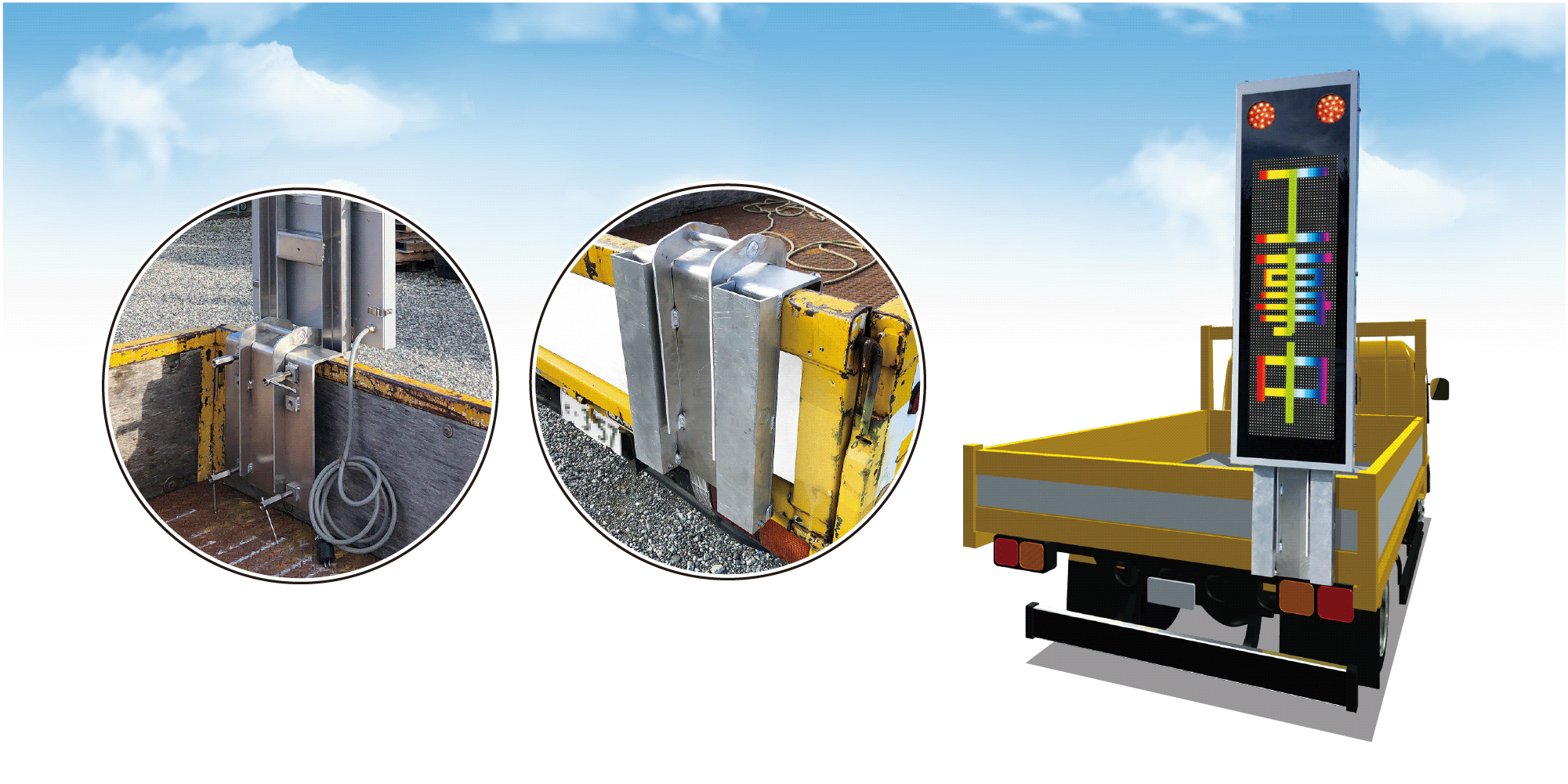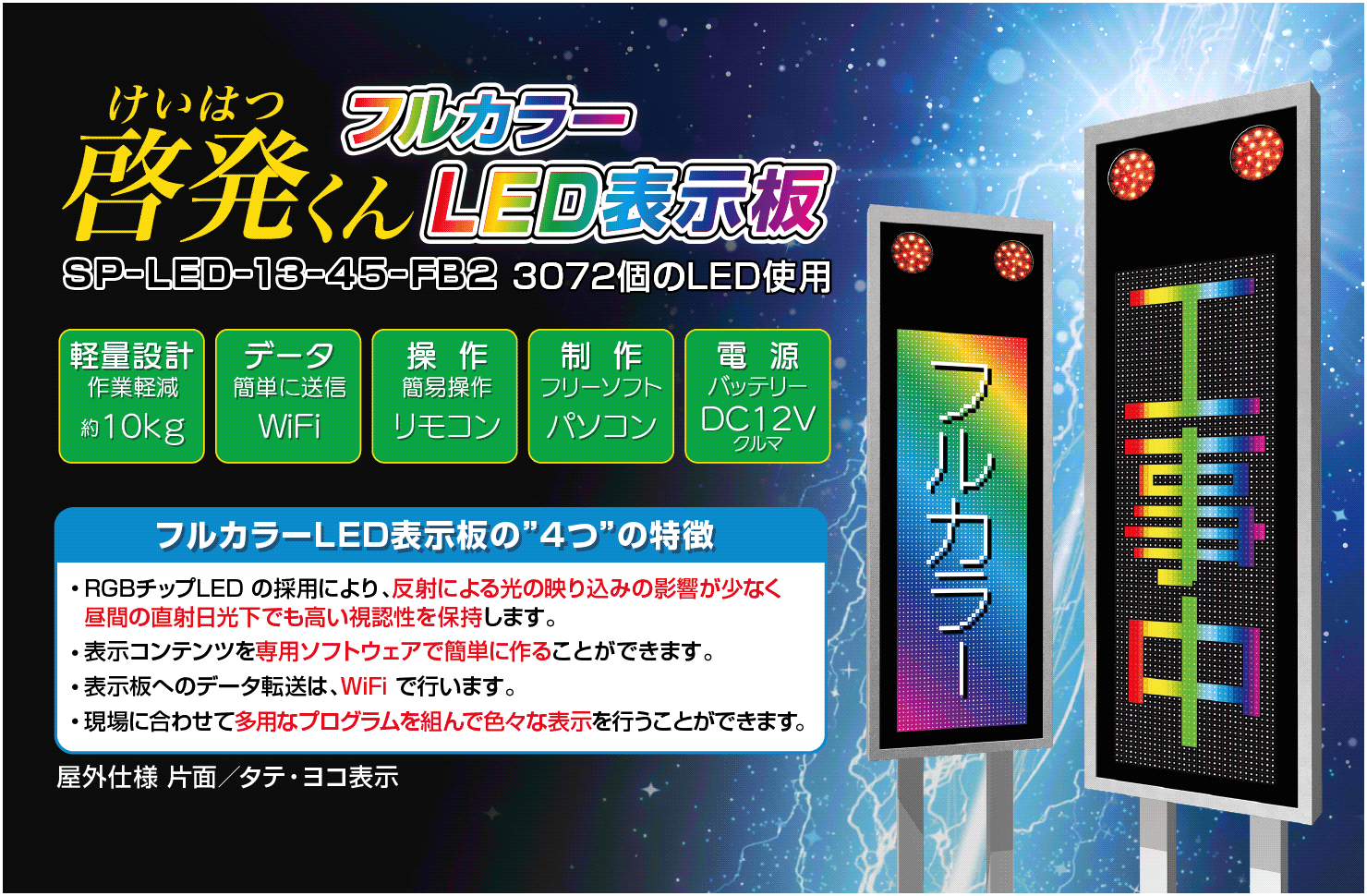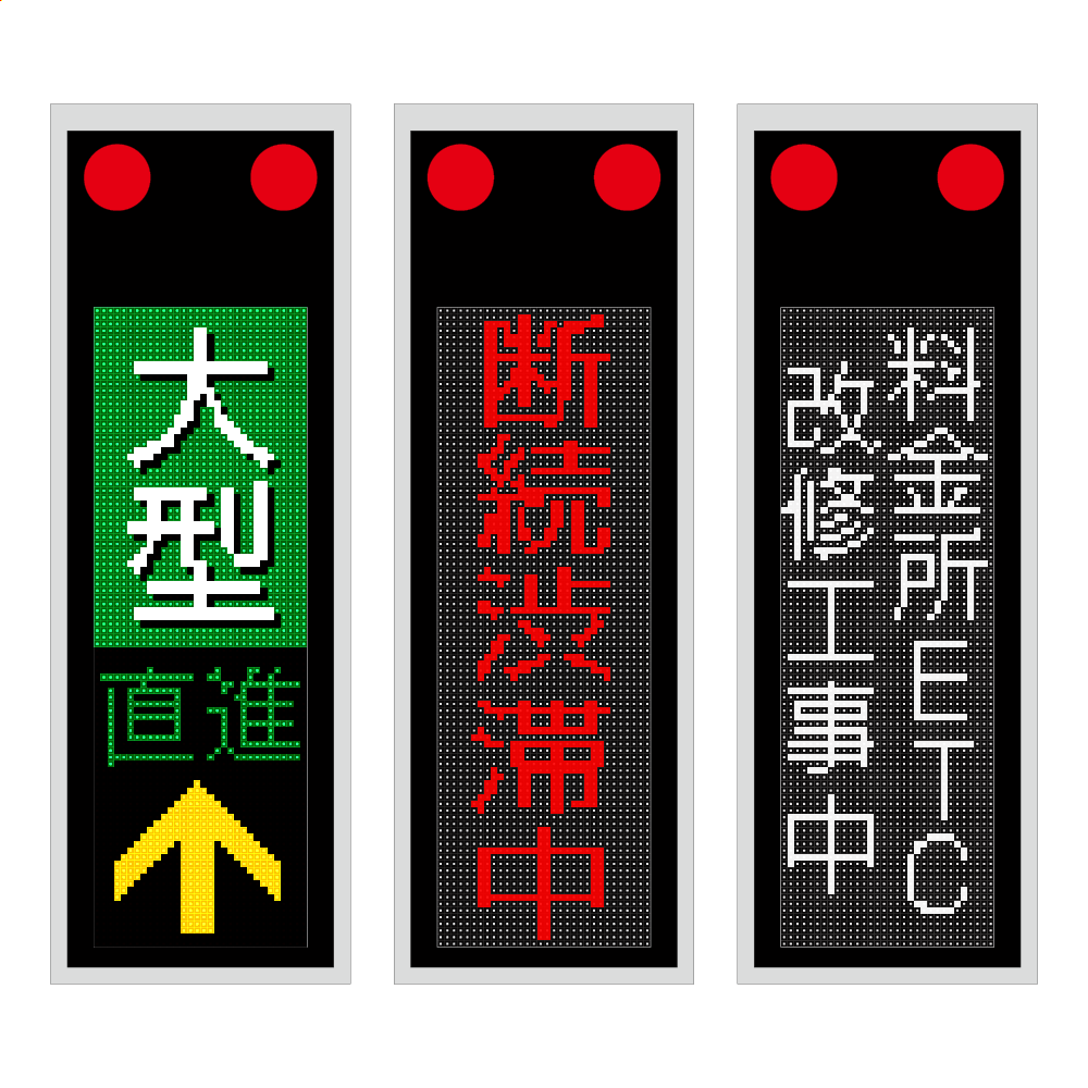 | 表示内容 | テキスト文字・動画・写真 ※文字表示パターン 固定・スクロール・点滅 ※現場で撮影した写真や動画を表示 ※企業や自治体のPR広告を表示) |