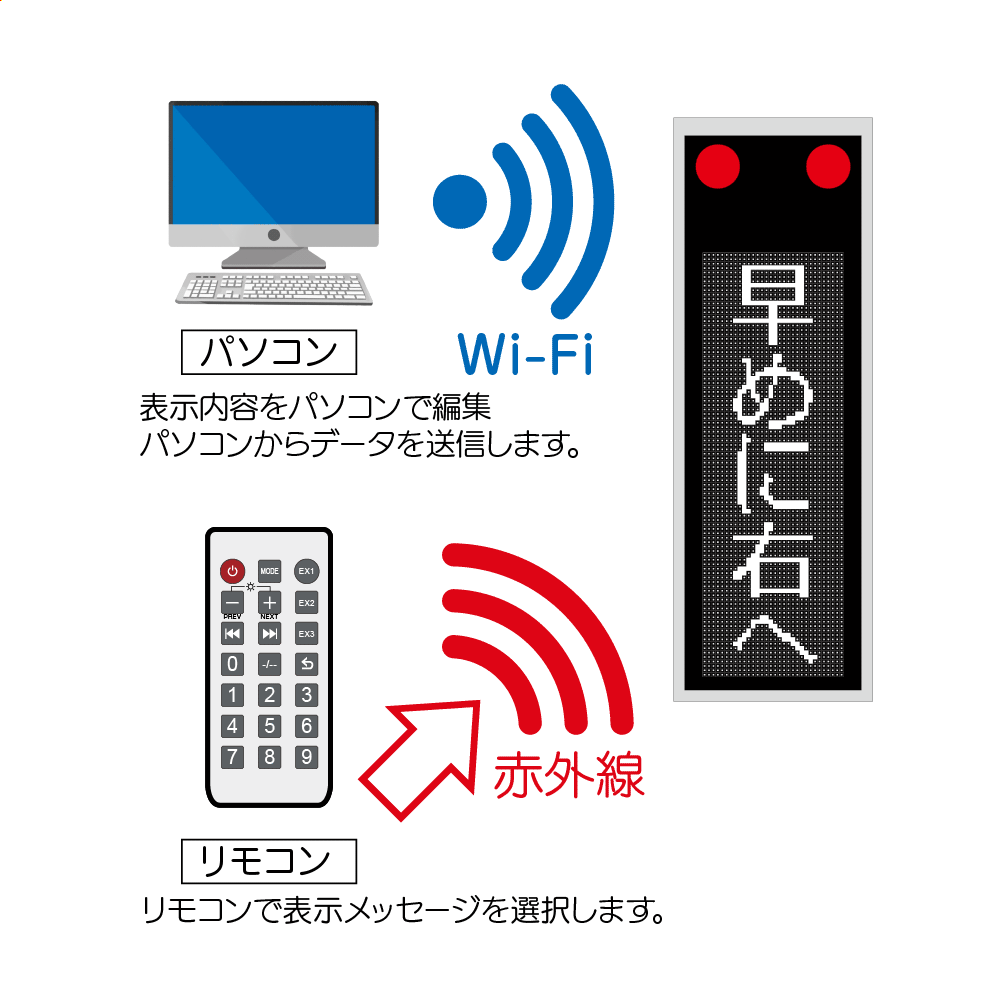 専用リモコンで表示変更が可能です。パソコンとWi-Fi環境が あれば、専用ソフトウェアで自由自在に表現が可能です。